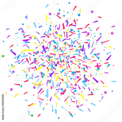 Explosion. Texture with colored elements on white. Geometric background with confetti. Pattern for design. Print for banners, posters, flyers and textiles. Greeting cards