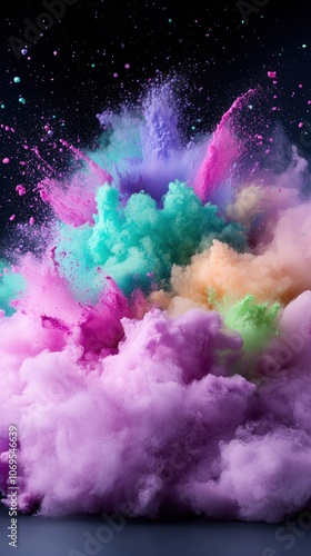Explosive burst of vibrant color powders in dynamic motion against black background