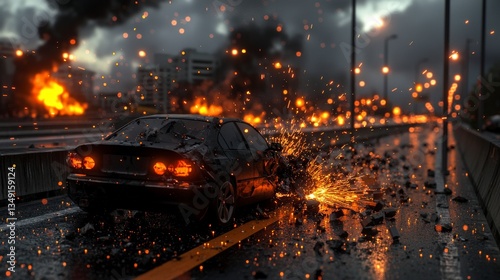 Explosive car crash scene on urban highway nighttime chaos dramatic action dark environment intense viewpoint