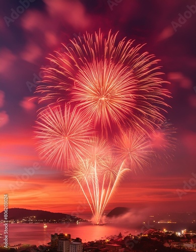 Explosive energy of fireworks with bokeh balls in bright reds, pinks, oranges, and yellows