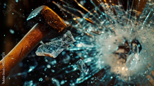 Explosive hammer strike shattering glass in dynamic freeze motion