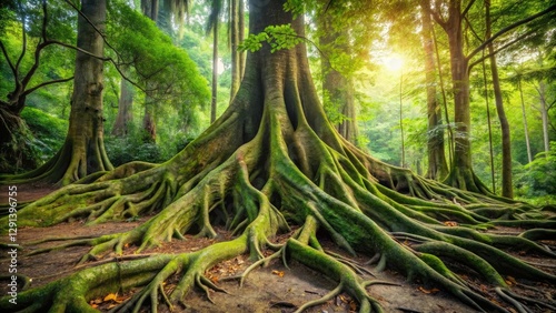 Exposed roots of a large tree surrounded by lush foliage in the forest, outdoors, greens, plants, tree roots