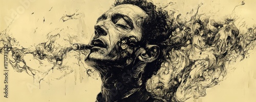 Expressive Illustration of a Man with a Cigar and Intricate Smoke Patterns Capturing Artistry and Imagination in a Surreal Composition