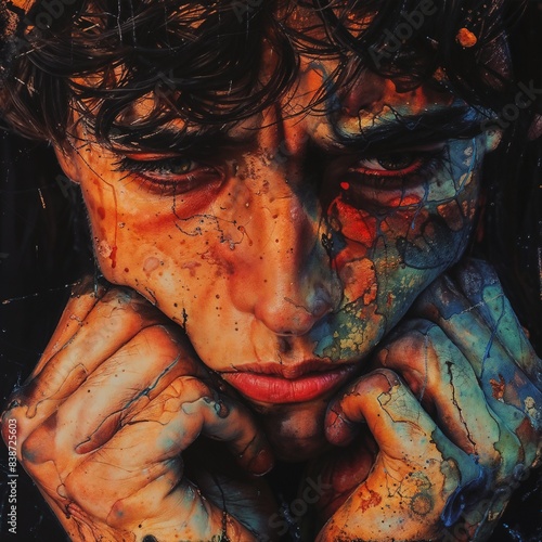 Expressive Portrait of a Painted Person with Hands on Face - Depression And Anxiety