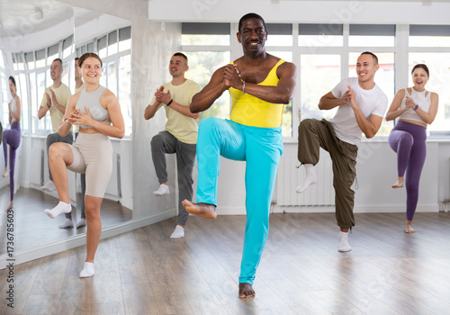 Expressive sporty african american fitness trainer in blue trousers and yellow tank top leading dynamic zumba class to group in spacious mirrored studio..