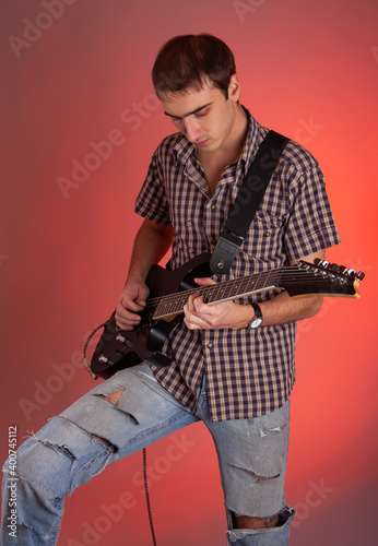 Expressive young man playing guitar on red background. Musician in beautiful hall.
