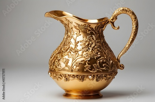 Exquisite Floral Artwork Adorning a Shiny golden Jug Against a Clean White Background. Golden Elegance