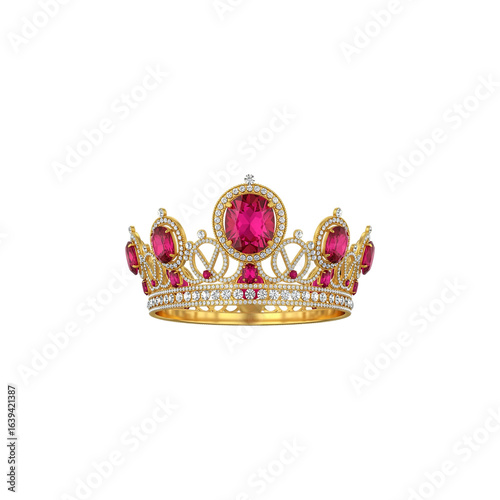 Exquisite golden tiara adorned with large oval and smaller round ruby gemstones and sparkling diamonds on a black background