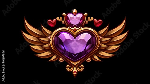 Exquisite Heart-Shaped Ornamental Winged Emblem with Luxurious Golden Accents and Vibrant Purple Gem