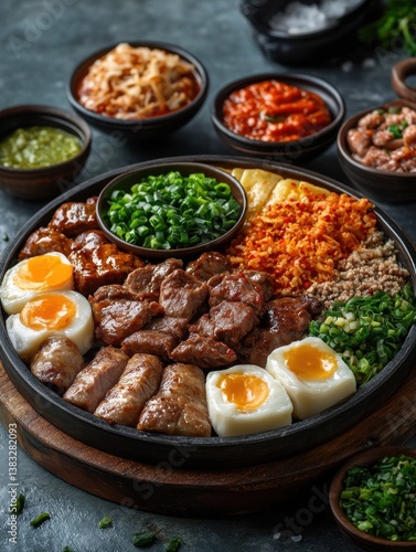 Exquisite Korean Bibimbap Bowl with Marinated Beef and Soft Boiled Eggs on Dark Background Studio Shot
