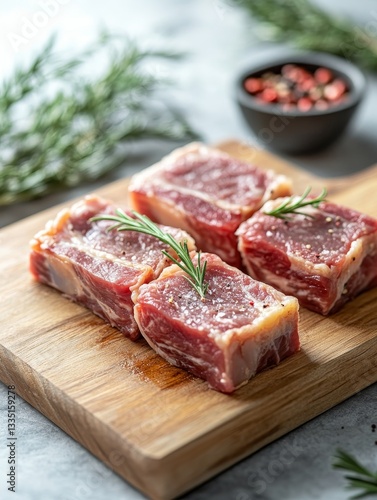 Exquisite Raw Beef Steaks with Rosemary Sprigs on Wooden Board for Gourmet Culinary Creations and Flavorful Dining Experiences, a Butcher's Cut of Fresh Protein