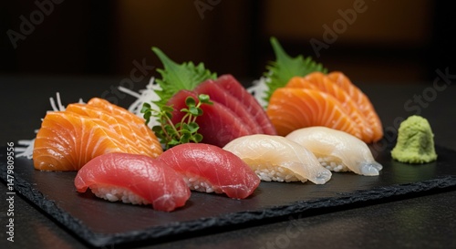 Exquisite Sashimi and Nigiri Arrangement on Slate Platter Close-Up Shot