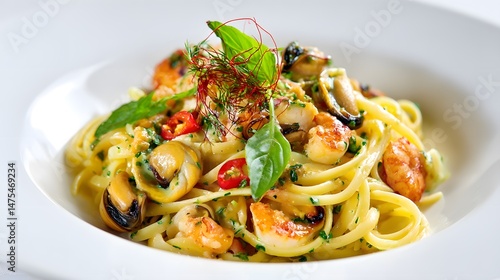 Exquisite seafood pasta with shrimp, mussels, and fresh basil, elegantly presented.