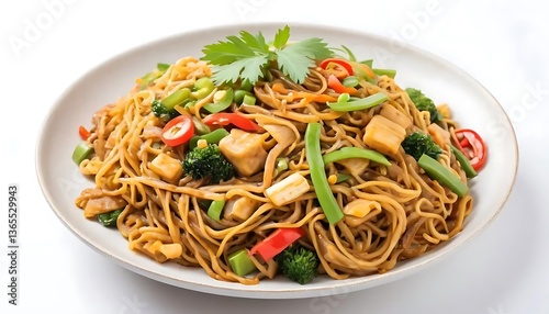 Exquisite stir-fried noodle dish adorned with fresh vegetables and tofu cubes