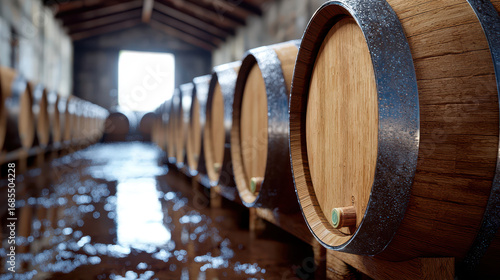 Exquisite wine barrels lined in rustic cellar, reflecting serene atmosphere of winemaking. wooden barrels showcase craftsmanship and tradition