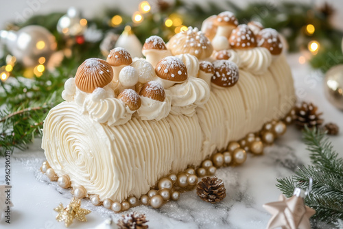 Exquisitely decorated Yule log cake with cream swirls, edible pearls, and marzipan mushrooms