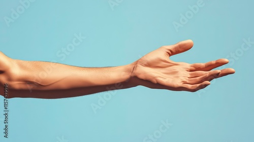 Extended male hand open and ready to help. Human arm giving. Connection structure. 3D vector illustration with empty place. Can be used for brochure, poster, presentation, flyer or banner.
