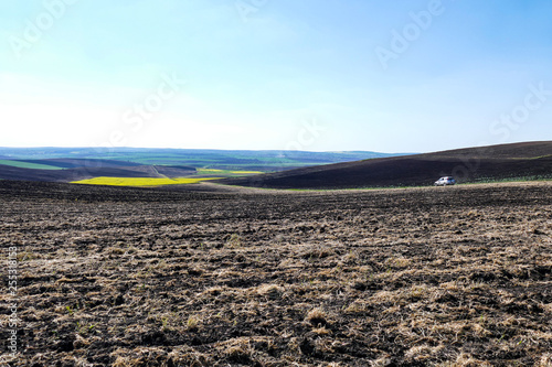 Extensive аrable land. On the horizon - blooming yellow rape and blue sky.