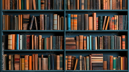 Extensive Collection Of Antique Books In Dark Blue Bookshelves With Warm Lighting