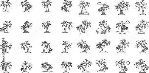 Extensive collection of diverse minimalist outline vector illustrations of various tropical palm trees, ideal for summer vacation, beach travel, and exotic island-themed graphic design projects.