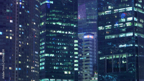 Exterior Establishing Of Modern Office Skyscraper Buildings At Night