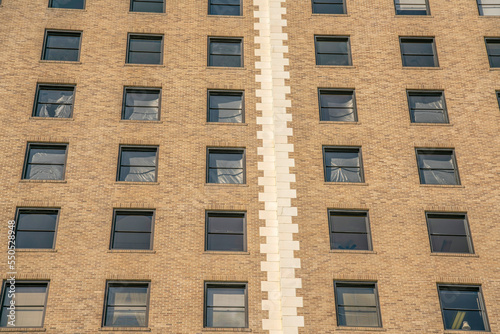 Exterior of residential building with square windows and brick wall