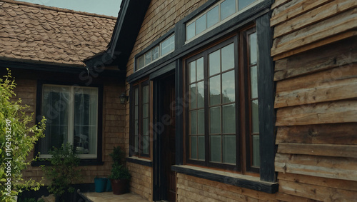 Exterior view of a house with wood siding and dark-framed windows. The house features a brown tiled roof and multiple windows of varying sizes. Part of a green shrub is visible to the left.