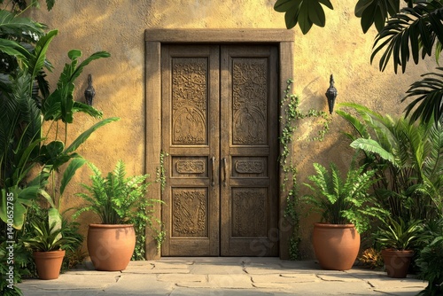 Exterior view of a weathered wooden door on a sun-drenched building.