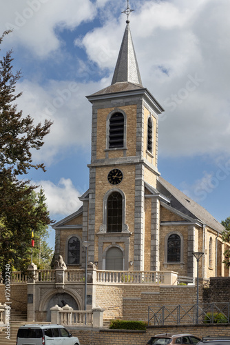 Exterior view of Our Lady of the Assumption Catholic church in the village of Tintigny, in Luxembourg province, Belgium.