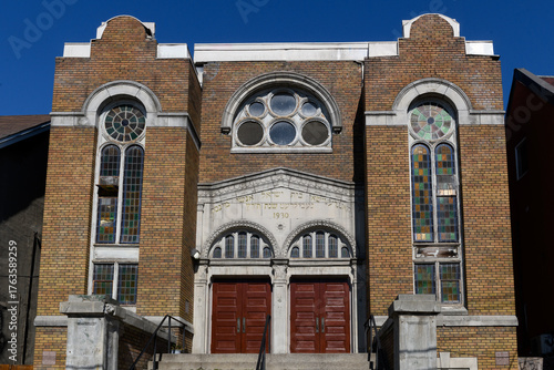 Exterior view of the large, brick edifice of Anshei Minsk, a synagogue in the Kensington Market neighborhood of Toronto, Ontario, Canada.