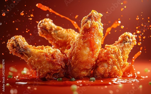 Extra crispy fried chicken wings with hot sauce splashes, on a deep red-to-orange gradient background