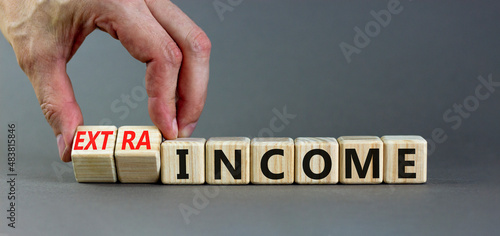 Extra income symbol. Businessman turns wooden cubes and changes concept words income to extra income. Beautiful grey table, grey background copy space. Business and extra income concept.