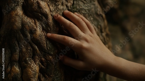 extreme close up, young boy's hand touching tree, tree of life cinematic,