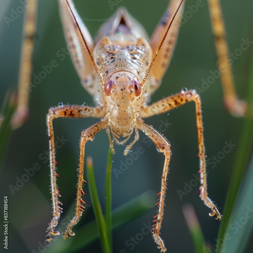 Extreme close-up of a cricket's body and legs, the texture clearly visible, set against a blurred meadow background