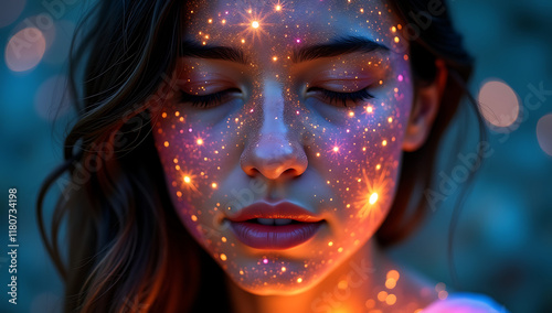 “Extreme Closeup of a Face with a Galaxy Map Projected Onto It” – Detailed star maps and constellations illuminating the face, symbolizing cosmic connection and wonder.