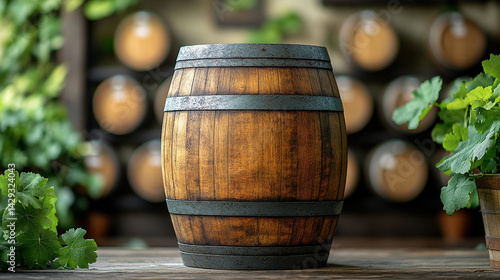 Extreme close-up of a modern empty wooden barrel standing upright in a dim cellar with rows of barrels fading into the distance, symbolizing tradition, craftsmanship, and timeless aging processes.