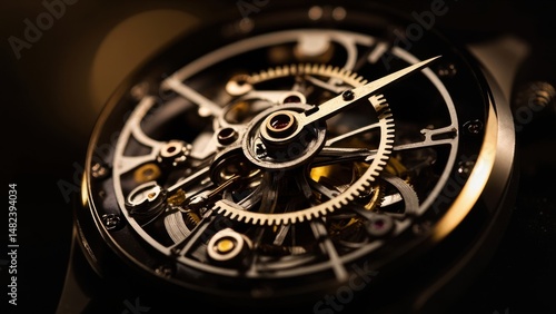 Extreme close-up of a watch mechanical movement focusing on the intricate gears and hands. Time and mechanical accuracy concept