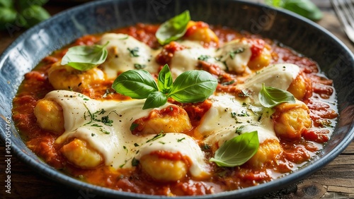 Extreme close-up of gnocchi alla sorrentina nestled in bubbling tomato sauce and mozzarella with fresh basil.