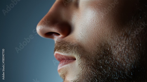 Extreme close-up of male nose and lips with stubble. Natural and detailed portrait concept.