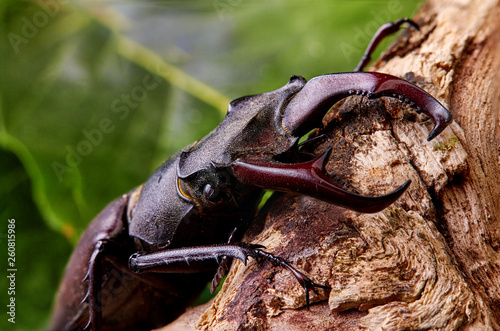 Extreme closeup.Stag beetle sitng on the wooden branch . beetles background.Macro.Stacked photo - deep focus image.