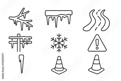 Extreme Ice Storm Icons. Line style icons of Extreme Ice Storm: Tree Branch, Glazed Surface, Slick Road, Power Line, Icicle,