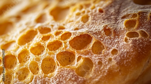 Extreme macro photography of artisanal bread surface revealing labyrinthine patterns of crackling crust, honeycomb-like structure of air pockets, delicate dusting of flour trapped in minute crevices,
