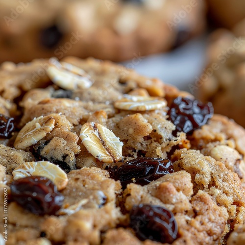 Extreme macro shot of a single oatmeal raisin cookie, emphasizing the coarse texture of oats and dark raisins.