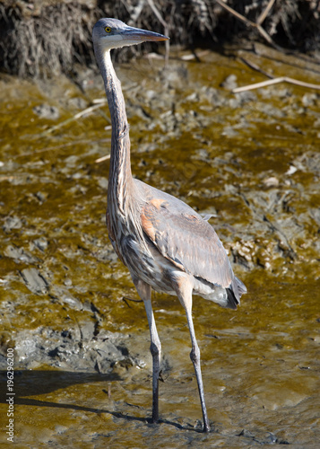 Extremely close view of a great blue heron, seen in the wild in North California (700mm telephoto)