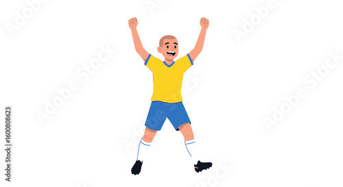 Exuberant soccer player celebrating a goal with arms raised in triumph and joyful expression full body shot showcasing athletic achievement isolated