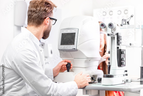 Eye doctor checking vision with modern ophthalmologic device in the cabinet