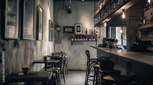 eye level, photo, bar, minimalistic interior, abstract large art frame, office snapshot, frame magazine