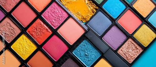 Eye shadow palette displays multitude of vibrant color pigments in compact squares, offering wide selection for creative makeup application.