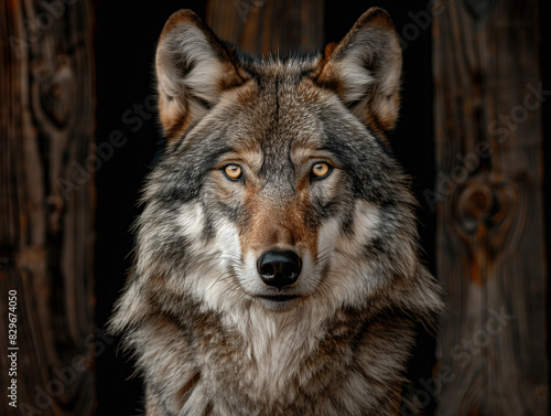 Eye to eye portrait with grey wolf female on black background. Square image