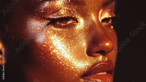 Eye-catching image of a woman with glitter on her face emphasizing her glowing makeup and stylish appearance